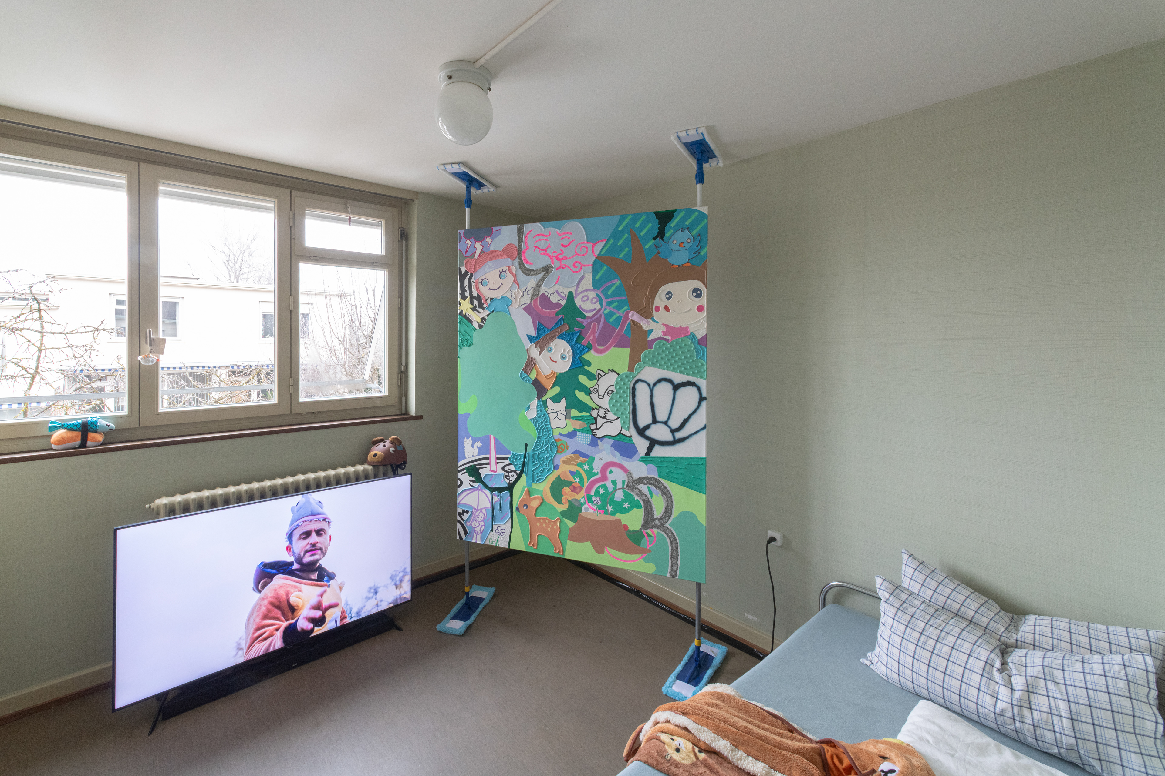 Luca Harlacher, if everyone draws a sun, it should stop raining, right?, 2026, mixed media on canvas,microfiber floor mops, 170cm x 130 cm