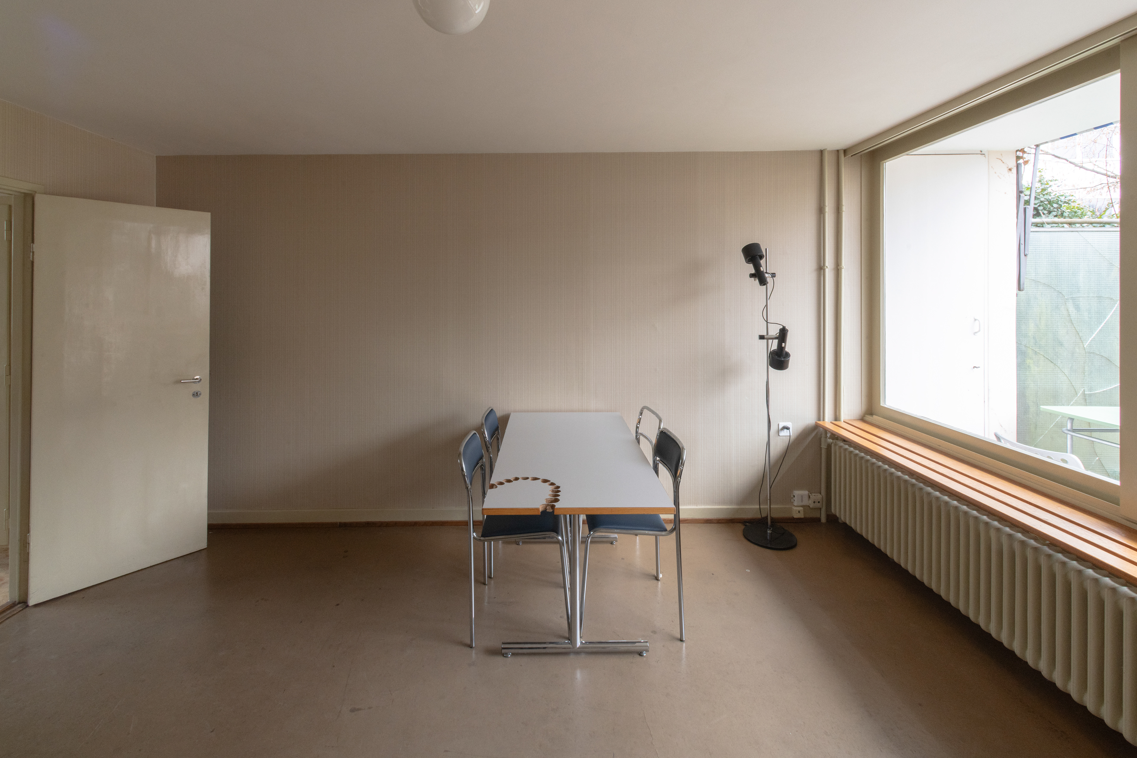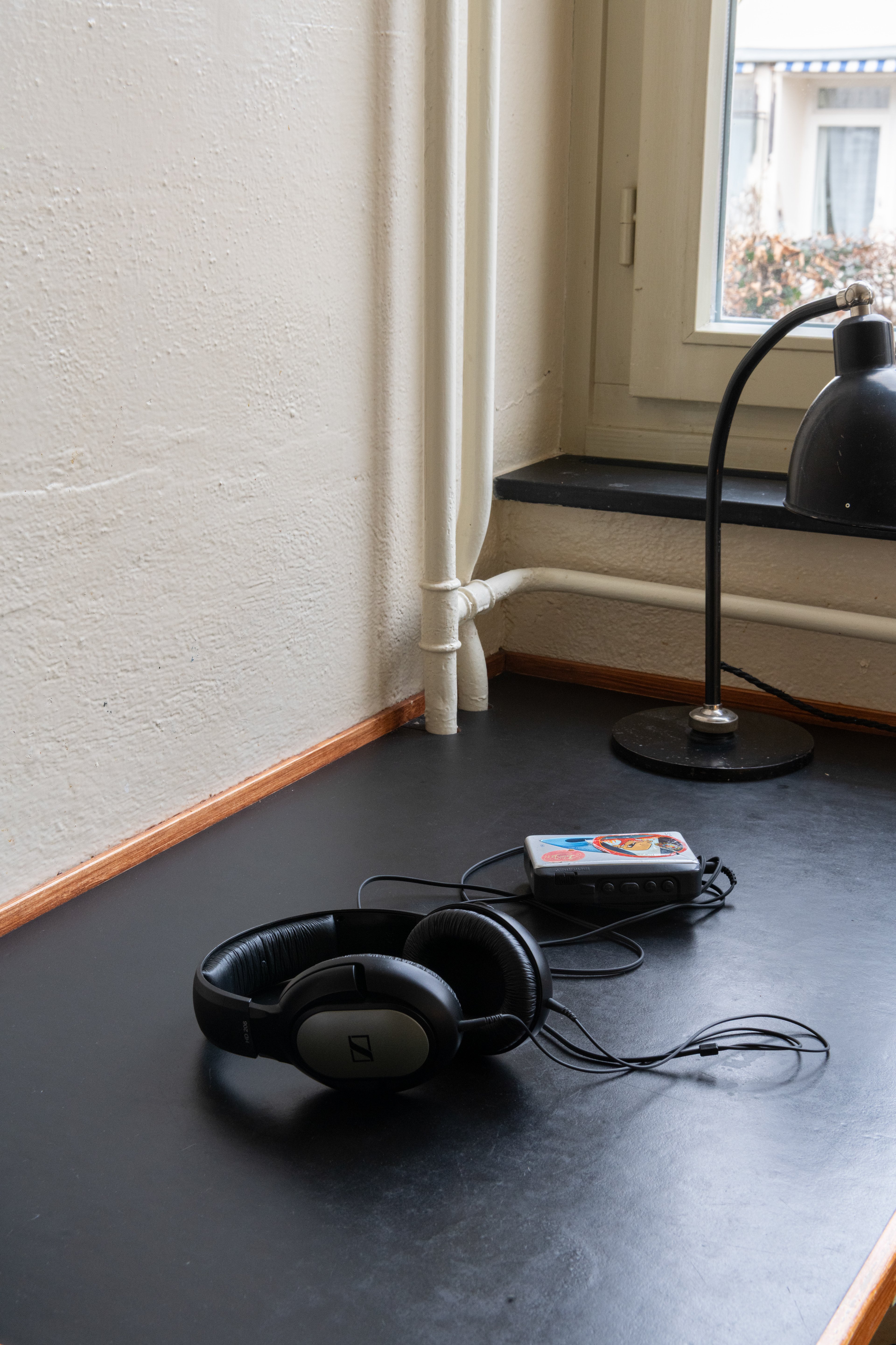 Aglaia Brändli, Die Scheune in der Gabelung, 2026, Kassettenspieler, Kopfhörer, Laserprints auf Transparentpapier, Klebeband, 8:31 min