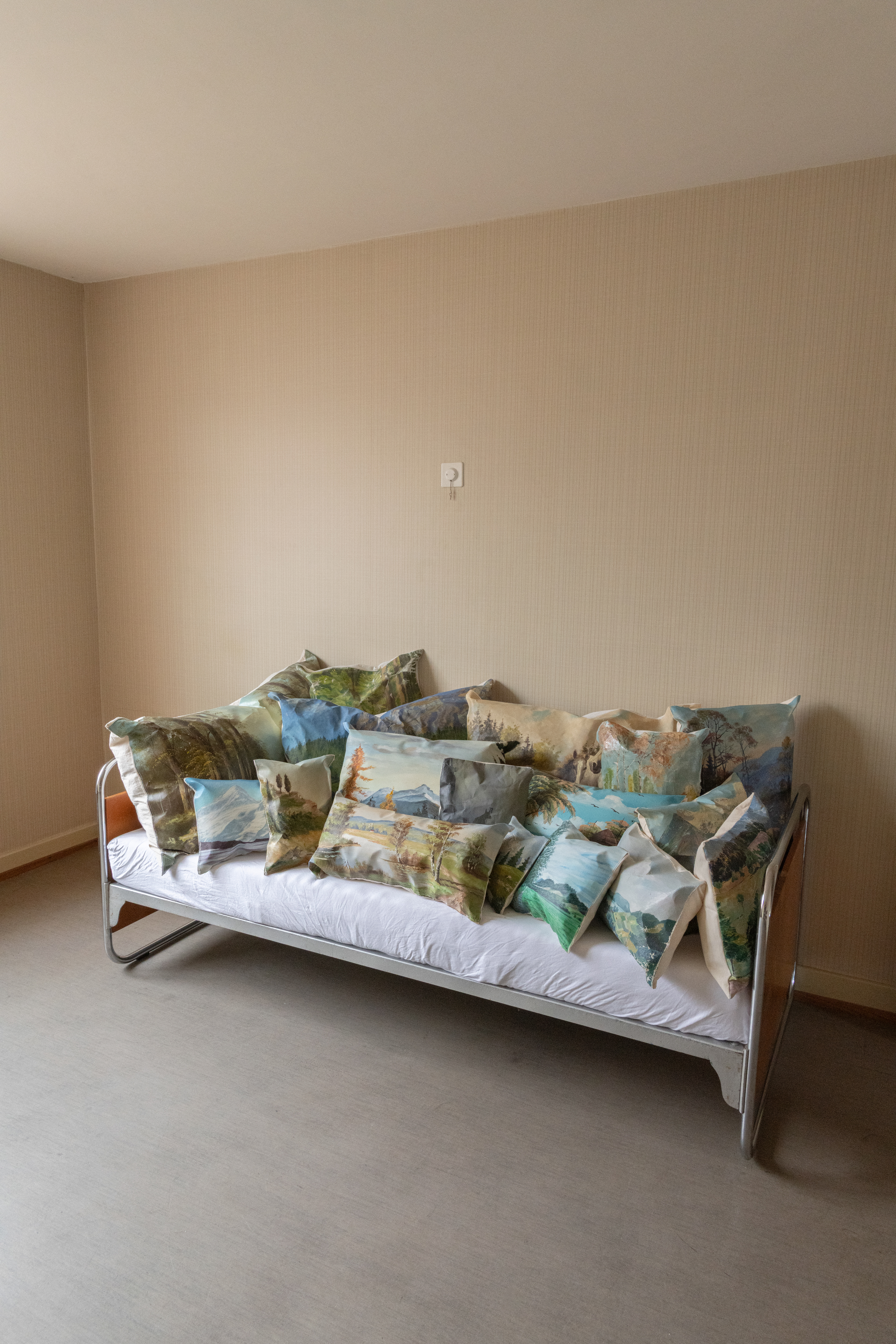 Meszmer Mueller, Kein Schöner Land, 2017/2026, Installation mit 16 zu Kissen umgearbeiteten Landschaftsgemälden und einer Soundcollage aus gesummten Heimatliedern aus der Schweiz, Deutschland, Österreich, Grossbritannien, Spanien, Italien, Georgien, Mexiko, den USA, Irak, Libanon, Ägypten, Irland, Thurgau, Bayern, Tschechien und Katalonien