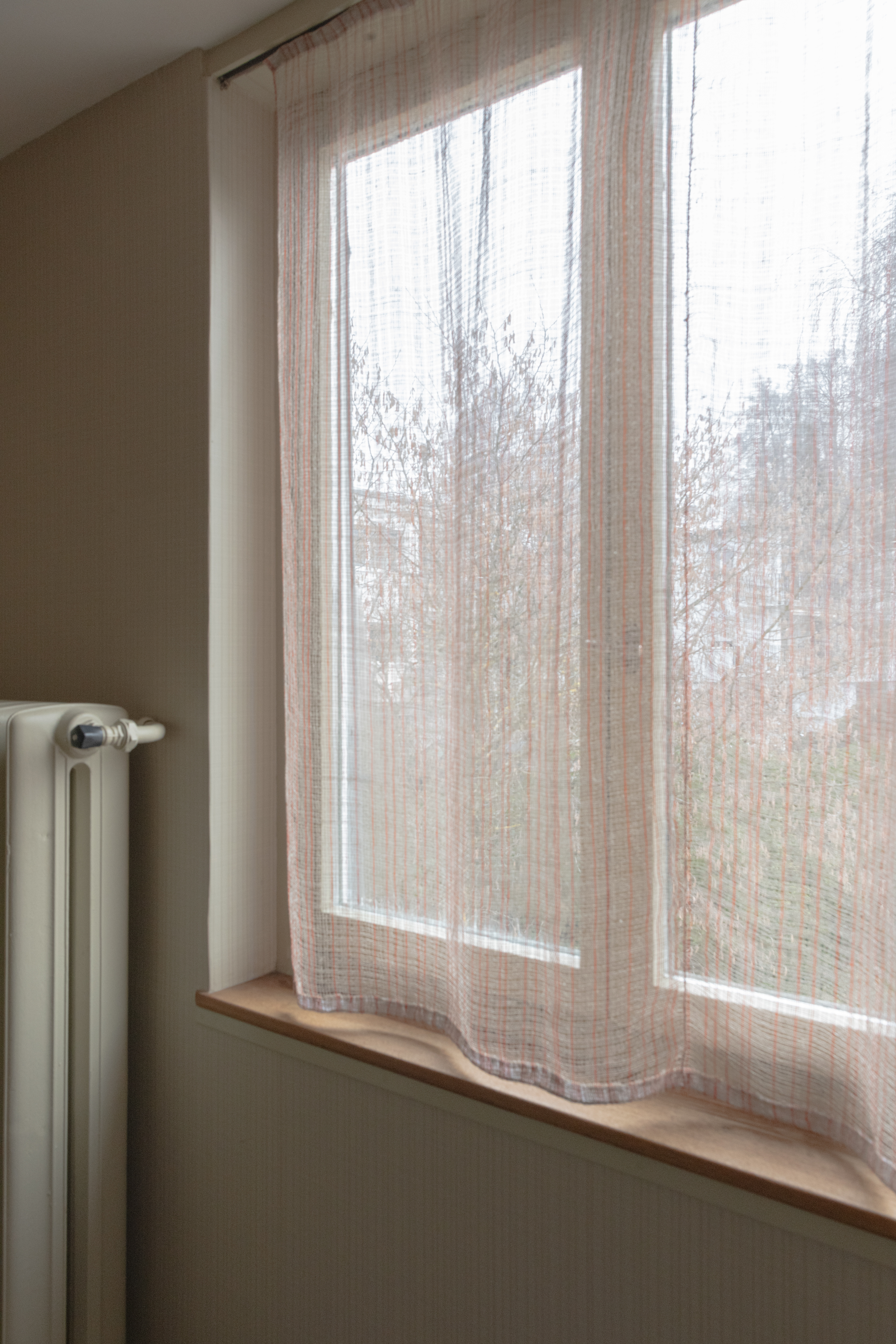 Selina Zürrer, Muster 3, 2026, Leinengarn (natur und gefärbt), Leinwandbindung, Gardinenband, Bügelband, Bleiband, Baumwollfaden 151 × 240 cm