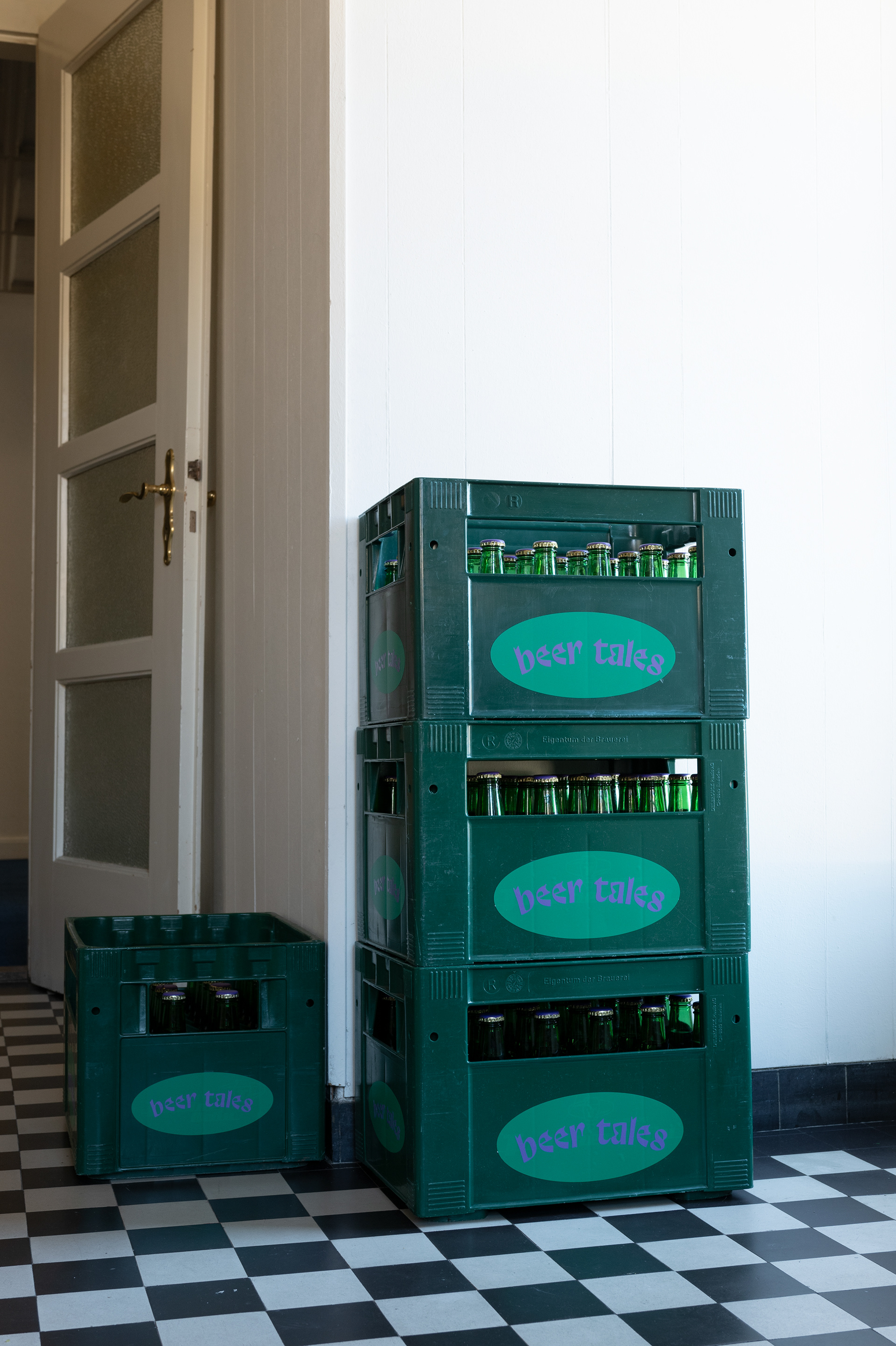 Selina Zürrer, Beer Tales, 2024, Beer bottles, 24 front and 24 back labels, beer crates, vinyl foil, Dimensions variable