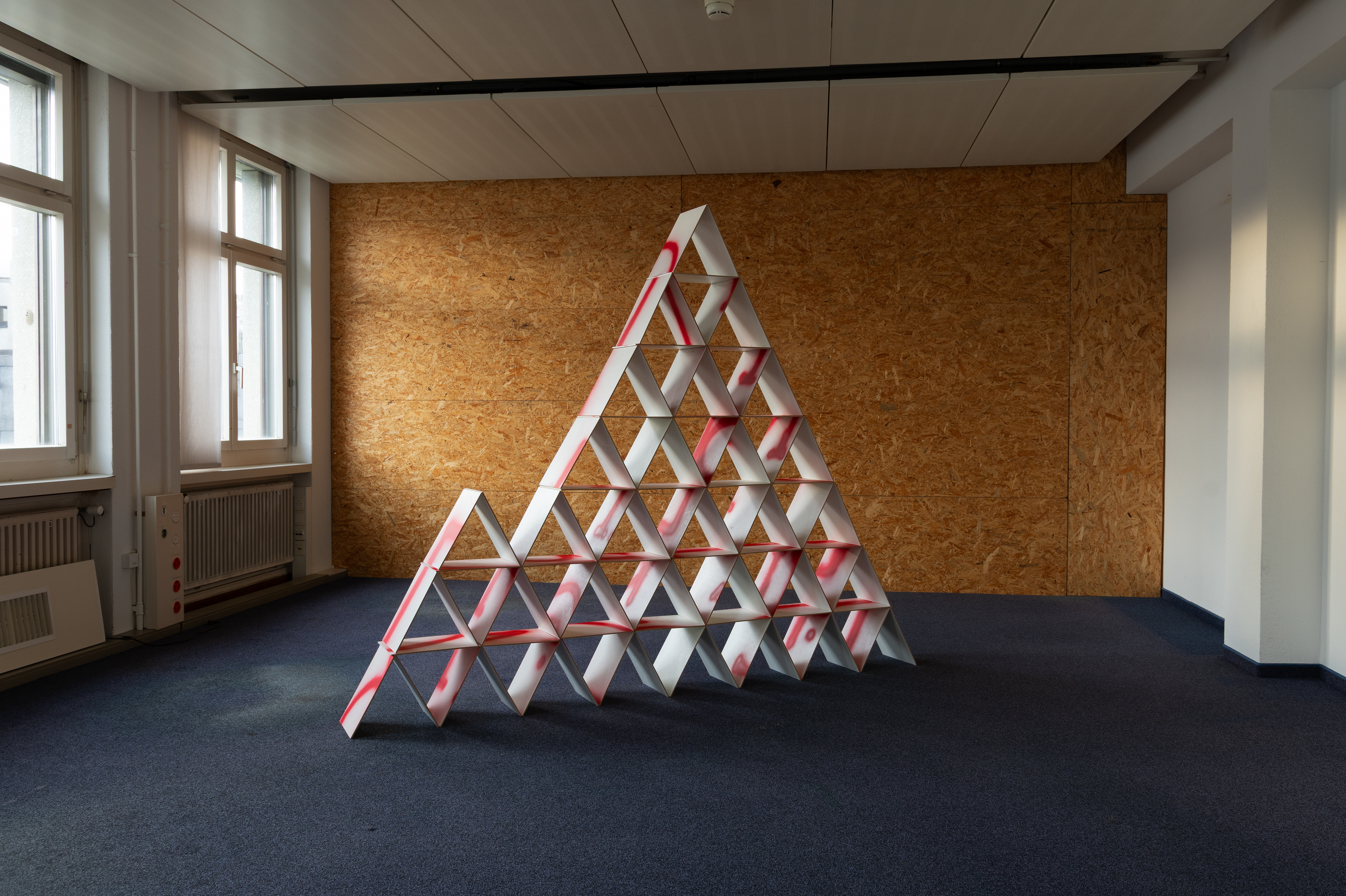 Nico Sebastian Meyer, dream of building (that’s the sentence), 2025, Found coated wooden panels, spray paint, glue, Variable dimensions